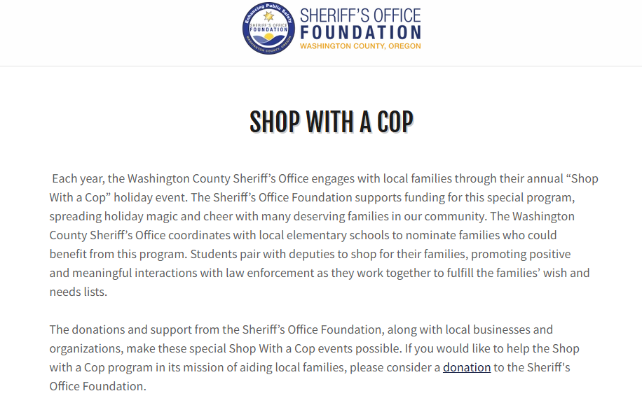 - If shopping is your thing, the pre-shopping event without deputies and kids but with WCSO staff, is happening on a selected date in early December. Meet at Fred Meyer on 11425 SW Beaverton-Hillsdale Hwy. Six volunteers needed.